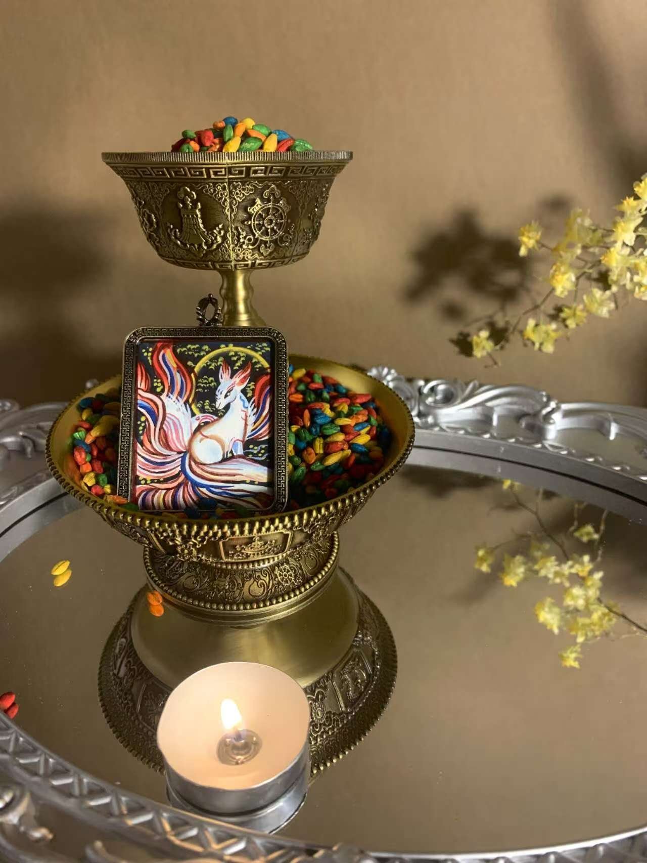 This Thangka Necklace is handcrafted from high-quality brass and 100% hand-painted with vibrant mineral pigments, embodying the powerful essence of the Fox Fairy from the Chinese folk religion. Our Thangka necklace has been blessed by real Monks from Tibet,the sacred Buddhist site in China, making it a powerful talisman. The Mystic Love & Prosperity Thangka infuses your life with good luck, prosperity, and marital bliss. This pendant is more than an accessory. It’s a talisman that brings peace, enhances personal relationships, and supports financial growth.